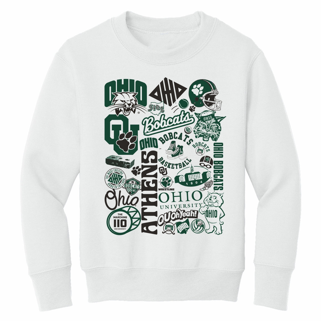 Go Bobcats! This Ohio kids sweatshirt is perfect for your kiddo to wear to tailgates or games! This crewneck sweatshirt features a white body with a variety of black and green OU logos that will really make your kiddo's Ohio spirit shine through! Shop the Official Fanstore of the Ohio Bobcats for Bobcat merchandise! This is an officially licensed collegiate product.